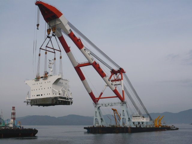 日本でも有数の海上クレーンですって! 吊り荷の重量は400トン以上あるけれど、楽勝ですって! レンタル料金、1日で一千万円ですって!