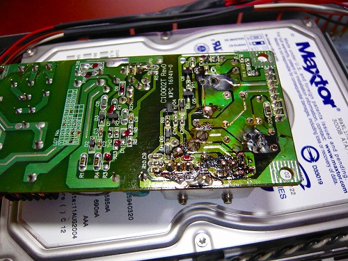 さて。この写真なのですが、もうこの段階で、向かって左側の電源ユニットが残念なことになっているのがよく分かりますねぇ。