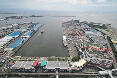 結構良い眺めですが、空き地とコンテナ港、微妙なマンションの群れ。