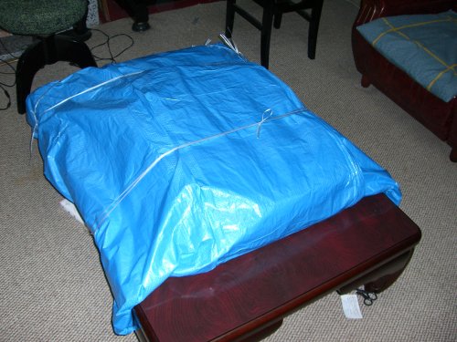 最も雨漏りしにくいと予想される部屋の選定から始まり、わざわざそのためだけにブルーシートを段取り、掛け軸の置く位置まで詳細にご注文、当初は上にかけるだけだったブルーシートも、ご覧の通り包み込み且つ雨水が入らないように四隅をテープでガード。