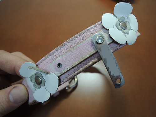 愛犬の首輪を修理しています。